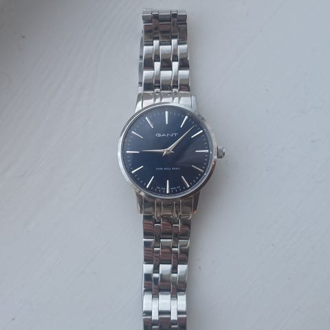 Stilren klokke fra Harper & Brooks. Passer både dame og herre. Designet i Oslo, med sveitsisk urverk. Har ikke brukt den, så den har stoppet, antakelig pga at batteriet har gått tomt. Jeg vil tro den fungerer fint om man bytter batteri.