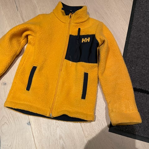 Helly Hansen fleecejakke i lyseblå og brun i størrelse 104. Jakken er ganske god og varm og har fungert veldig bra som et mellomlag eller ‘bare ut i bilen’-lag.