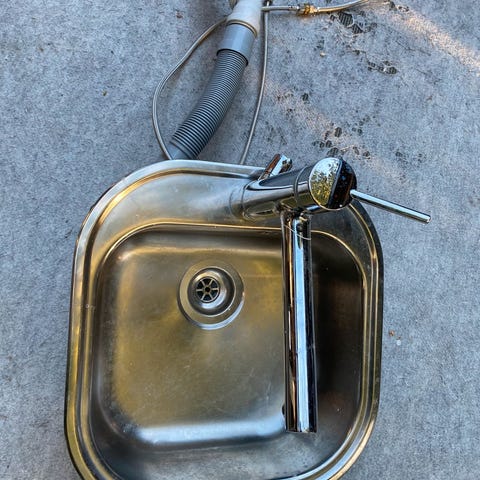 Kjøkkenvask laget i rustfritt stål. Produktet inkluderer avløpssystem i plast. Vasken har et enkelt design og er egnet for bruk i kjøkken.