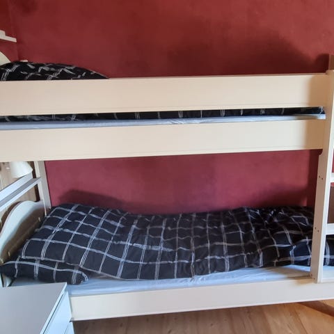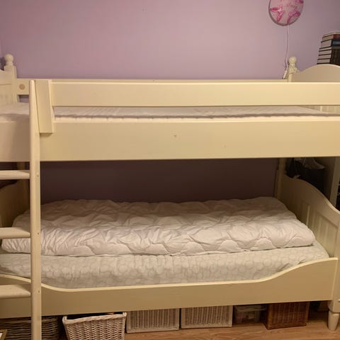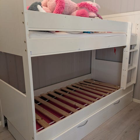 Skeidar køyeseng i hvitt treverk, designet for å gi soveplass til to personer. Sengen har en trapp for enkel tilgang til øverste køye og sikkerhetsrekkverk på øvre seng. Passer for barnerom eller gjesterom.