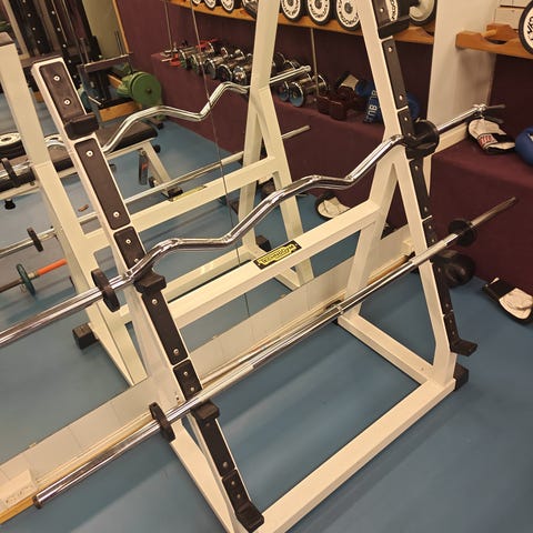 Technogym treningsstativ for vektstang i metall med hvit farge. Egnet for styrketrening og vektløfting. Stativet har plass til 4 stenger
