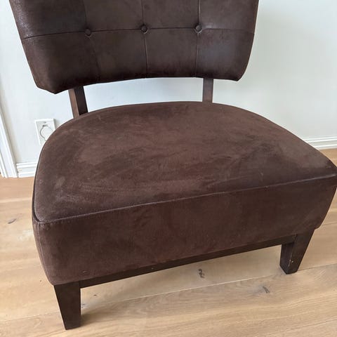 Pent brukt og i god stand, men med en liten skade på venstre side som ikke er veldig lett synelig (se vedlagt siste bilde) Perfekt som ekstra sitteplass eller dekorativ stol.