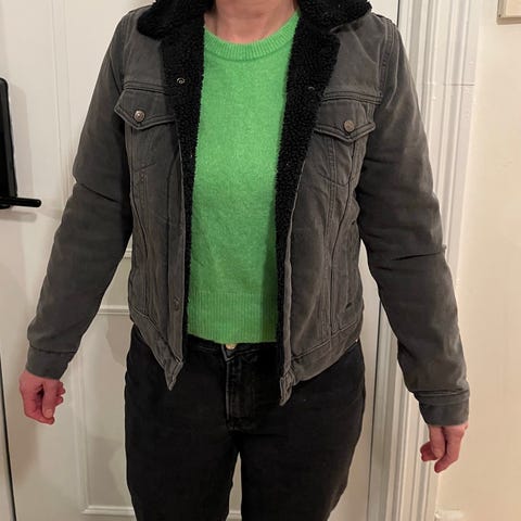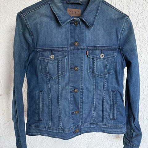 Levi's Andre jakker i blå denim for dame, størrelse M. Jakken har et foret innside med mykt materiale som gir ekstra varme og komfort. Den er laget i slitesterkt denimstoff og har klassisk design med knappelukking foran og brystlommer. Brukt et par ganger. I veldig god stand.
