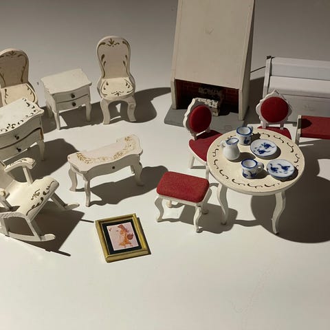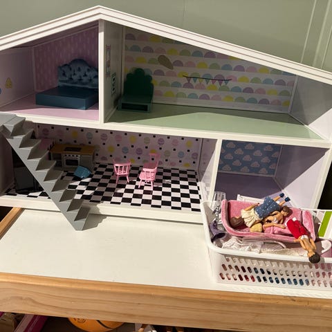 Dukkehus med møbler og 4 dukker. Pent brukt, med unntak av sengen som mangler 1 fot. Står likevel stødig.