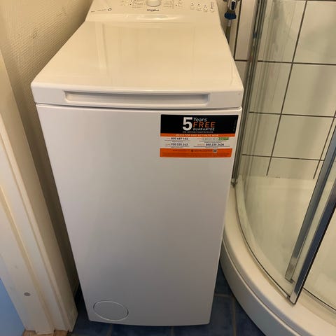 Electrolux frontmatet vaskemaskin med flere vaskeprogrammer og justerbare sentrifugeringshastigheter. Maskinen har et frontmatet design og et kontrollpanel med knapper og dreiebryter for valg av ulike innstillinger. Det er noen synlige slitasjer og skader på overflaten, men den fungerer helt fint.