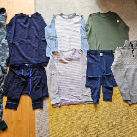 2 trøyer (1uåpnet) og 2 longs i 100%merinoull selges. Veldig lite brukt, men et lite hull som er pent sydd og lite synlig på rumpa på ene longsen. Se bilde