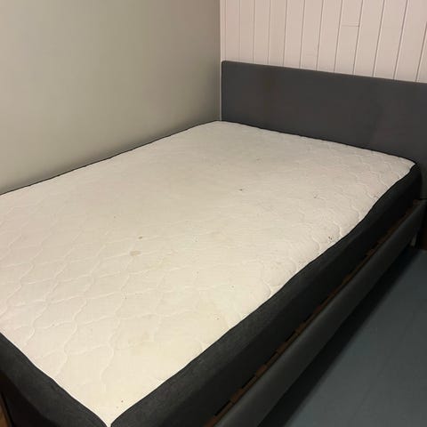 Selges komplett med seng, sengemadrass og overmadrass.