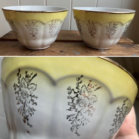 Nydelig lys gul farge og med blomster/rosedekor og vakre gulldetaljer