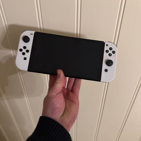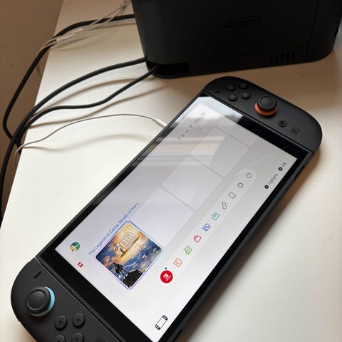 Nintendo Switch spillkonsoll selges grunnet overgang til Switch 2. Alt på bildet medfølger