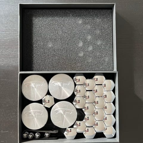Komplett sett til 4 hjul inkludert verktøy for mutterhetter. Passer originale Tesla felger og andre med 56mm nav