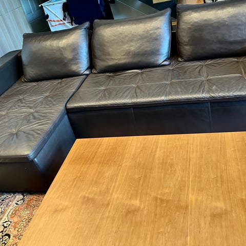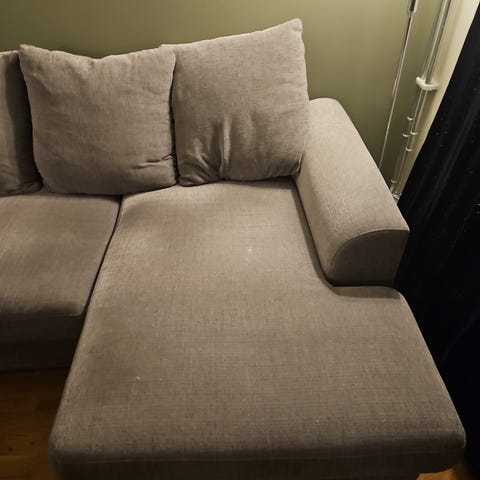 Skeidar sofa av serien Alfred gis bort. Det er en 3-seter med tilhørende puff. Ny i 2017. Sofaen har blitt brukt i påvente av ny sofa. Den har noen flekker fra forrige eier som ble forsøkt vasket bort og litt nuppete. God å sitte i, men bør renses. Må hentes denne uken