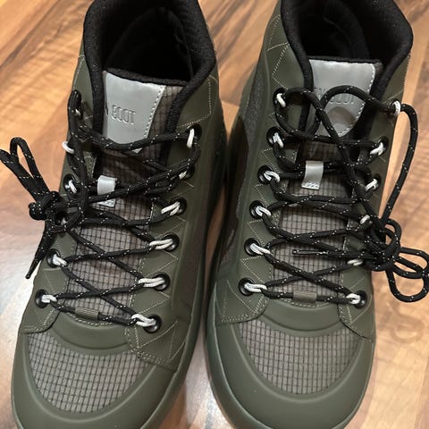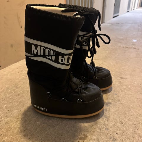 Jeg fikk disse flotte Moon Bootsene til jul, men de er dessverre for store. Størrelsen er 45-47. Fargen er et fint mørkebrunt, sålen er av gummi og bør være veldig bra på snø - men har dessverre ikke kunnet bruke dem, siden de må selges nå. Har bare prøvd dem inne i huset.