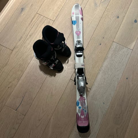 Dynastar alpinski i lengde 100cm og alpinstøvler i mondpoint 215, lengde 255mm (jeg mener det tilsvarer cirka størrelse 33-34). Justerbare bindinger.