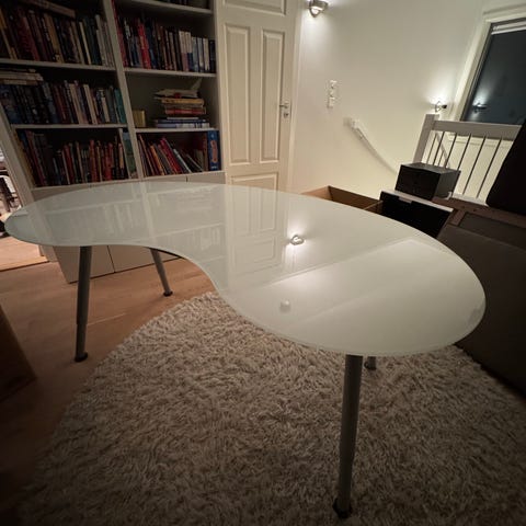 Skrivebord med praktisk nedleggbar bakplate selges. Her kan man skjule skrivesaker, tastatur eller bøker når man ikke bruker det. I tillegg er det praktiske strikker på bakplaten som gjør at man kan henge opp ark eller skriveutstyr.
