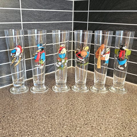 Aukrust, Flåklypa glass, ca 11 cm høye. Alle 6 har forskjellige motiver av Solan Gundersen. Signerte Aukrust. Se bilder.