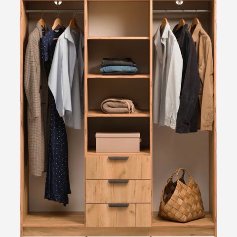 IKEA garderobeskap i treimitert utførelse. Skapet består av flere seksjoner med hengslede dører. Innvendig har det klesstang for oppheng av klær, skuffer midt på og hyller nederst for brettede klær eller oppbevaring. Ytre mål er ca. 196 cm høyde, 193 cm bredde og 49 cm dybde. Egnet som garderobeløsning på soverom eller i gang for oppbevaring av klær og tekstiler.