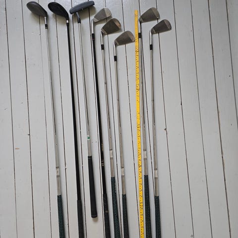 Har disse golfkøllene liggende etter min mor. Spiller ikke golf selv, så jeg vet ikke mer enn det som står på køllene, men dette er det jeg tror er et komplett sett for dame. S,P, 3,4,5,6,7,8, 5 driver, og putter fra Vantage Classic III. Lengde på køllene varierer mellom 90 og 100cm.