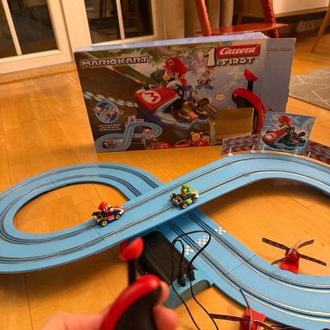 Analog bilbane i 1:43 skala for den minste med biler fra Mario-verden og sjåførene Mario og Yoshi. Banelengde på 2.9 m med bro, spinnere og utklippbart bilde av Mario som plasseres i senter av den ene svingen. First banene fra Carrera er ekstra barnevennlige og trygge da de benytter 4x C-batterier(kjøpes separat) istedenfor veggkontakt.