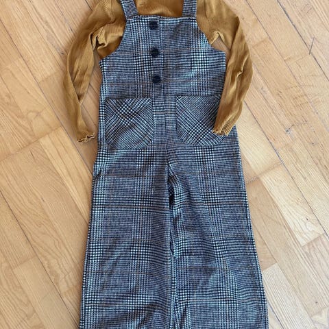 Vide bukser med løs passform og T-skjorte for høyde 122. Kort topp/jakke som kan brukes litt lenger(130).Brukt kun noen få ganger. Meget god stand. Settet ble kjøpt for 600 kroner.