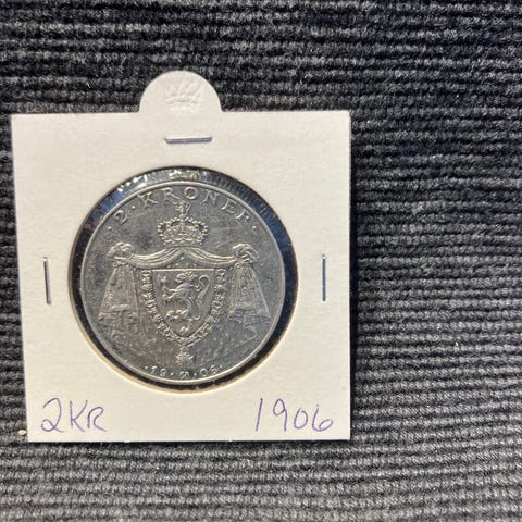 Norge 2 kroner sølvmynt fra 1910 med portrett av kong Haakon VII. Mynten har valør 2 kroner og er preget i sølv. Egner seg for samlere av norske mynter og historisk numismatikk fra begynnelsen av 1900-tallet. Denne har lavt opplag. Kun 150 000 stk.