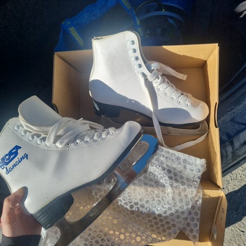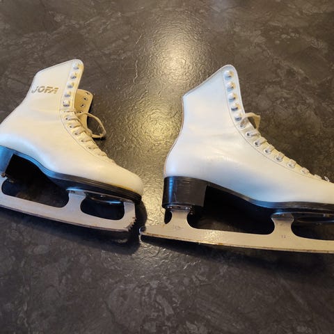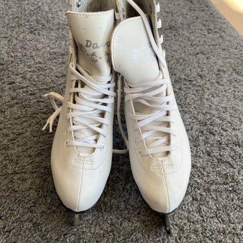 Davos kunstløpskøyter i størrelse 36. Skøytene er hvite med snøring og hæl i mørk farge. Overdelen er i syntetisk materiale med dekor på siden. Blad i metall egnet til kunstløp og generell skøytebruk på isbaner. Passer til barn eller ungdom som bruker skostørrelse 38.