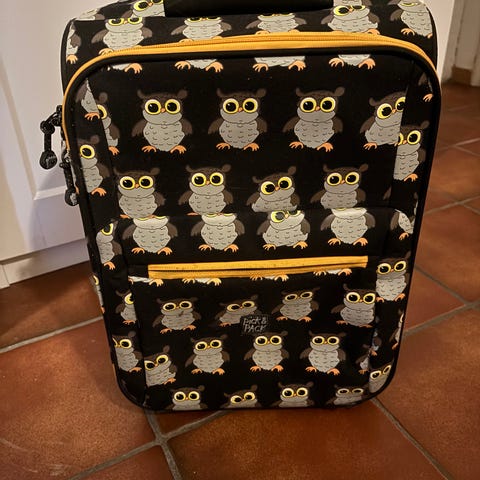 Pent brukt barnekoffert med froskemønster selges. Hjul og glidelåser i god stand og lite slitasje ellers.