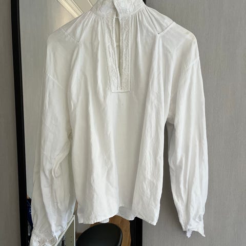 Sers lite og fint brukt bunadsskjorte- som ny. Nydeleg handbrodert rundt hals og ermer!