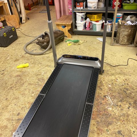 Kingsmith R2 hybrid tredemølle som går opp til 12 km/t, nok til en god joggetur. Modellen har håndtak/bøyle foran for støtte under bruk, her er det også stativ til mobil o.l., og sikkerthetspin som stopper møllen i nødstilfeller.