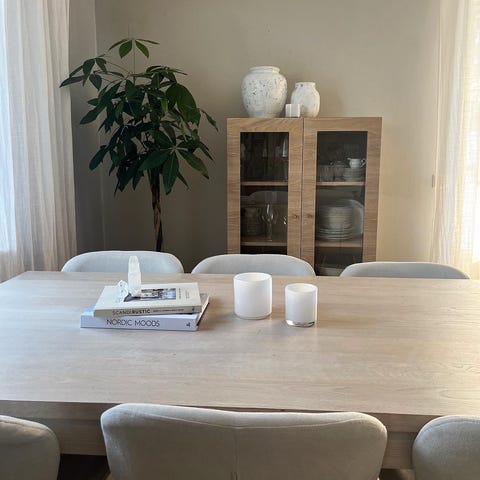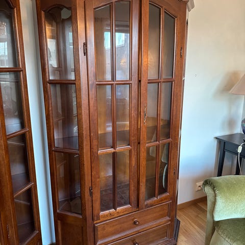 Selger et pent og solid vitrineskap med glassdør og glasshyller. Skapet har et klassisk uttrykk og passer perfekt til oppbevaring og fremvisning av servise, glass eller pyntegjenstander. Praktisk skuff nederst.
