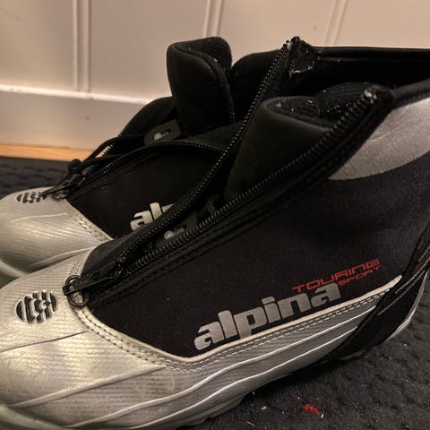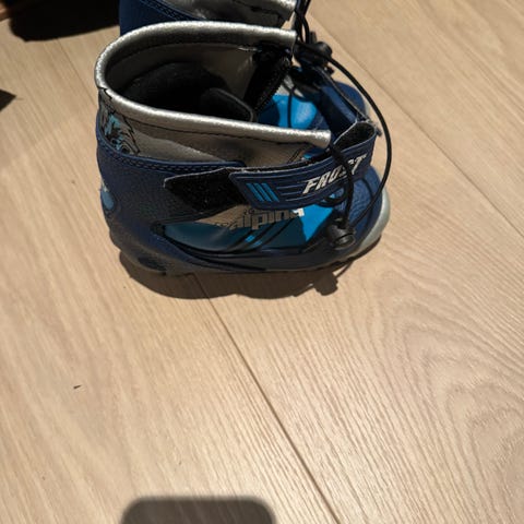 Alpina barne skisko i rosa og lilla med lys overdel. Skiskoene har snøring foran.