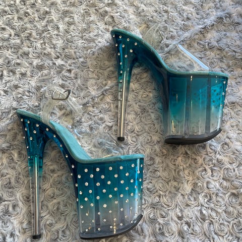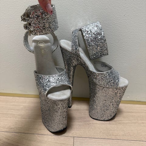 Selger knall rosa Pleaser sko i US str. 10, tilsvarer en litt stor str. 40. Brukt en gang, ingen riper i lakken, fremstår som ny. Den høyre skoen har fått en skygge på innsiden, se bilde.