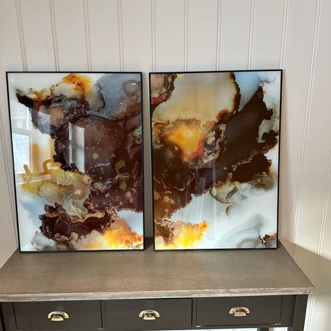 Abstrakt kunst veggbilder, sett med 3 stk. Motivene har organiske, abstrakte former i hovedsakelig grønne og mørke toner. Hvert bilde er innrammet i en enkel, mørk ramme som passer godt i stue, gang eller soverom. Bildene kan henges samlet som en serie på vegg for et helhetlig uttrykk.