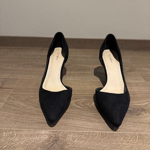 Zara hæler i størrelse 36. Skoene er i svart semsket skinn med spiss tå og smal stiletthel. Helt ubrukte, bare prøvd på.