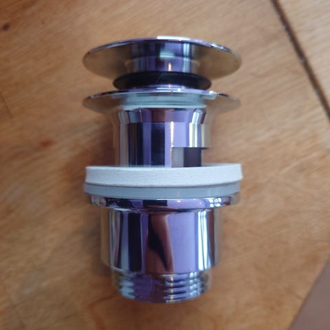 Damixa bundventil Click Waste i kobberfarge. Push-open/klikksystem for åpning og lukking av avløpet i servant. Leveres som komplett sett med ventilhus, propp og ring, beregnet for montering i baderomsservant.