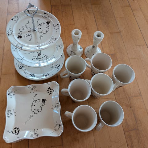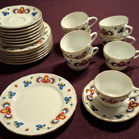 Pent brukte serveringsdeler fra Bondeservise. Stort fat 34 x 30 cm kr 200. Ovalt fat 31 cm kr 200. Stor bolle ø 23 cm kr 200, bolle ø 20 cm kr 150, bolle ø 17 cm kr 100. Liten bolle ø 12 cm kr 50. 2 stk saus kr 150 pr stk. Selges samlet for kr 800. Kan sendes.