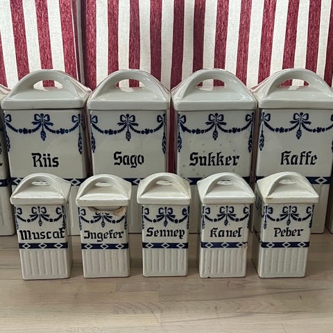 Sett med keramiske krydderkrukker i hvit farge med blå blomstermotiv på forsiden. Krukkene har lokk med toppknott og dekorative relieffdetaljer langs kantene. Egnet til oppbevaring av krydder eller tørre matvarer på kjøkkenet. Antall krukker og nøyaktige mål fremgår ikke av bildene, men de fremstår som små til mellomstore krydderbeholdere til benk eller hylle.