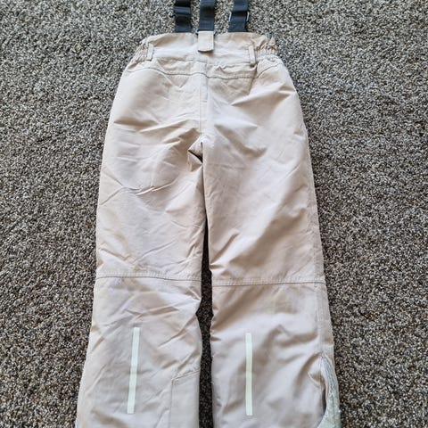Vikafjell vinter-/skibukse str 10 år. Farge: Hvit. Pent brukt, med unntak fra en mindre ripe i stoffet baktil på høyre fot (se bilde) og en ripe på høyre kne som har blitt lappet(se bilde). Mye bruk igjen.