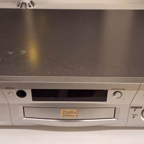 En kompakt, sammenleggbar DVD-spiller med innebygd skjerm. Enheten har kontrollknapper på fronten og tilkobling for strøm via medfølgende strømadapter. Det følger også med fjernkontroll.