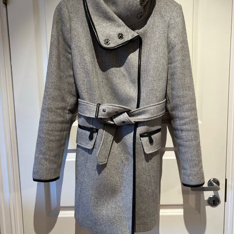 Esprit ullkåpe for dame i størrelse M. Kåpen har flerfarget rutemønster i beige, gult, blått og rosa, med ensfarget fôr på innsiden. Yttermaterialet inneholder ull, som gir et varmt og mykt plagg egnet som yttertøy i kjøligere vær. Modellen har klassisk krage, enkel knepping foran og store påsydde lommer. Passer som hverdagskåpe eller til mer pyntede anledninger.