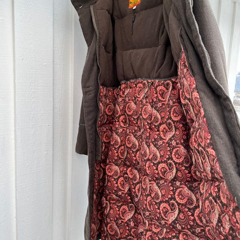 Den fremstår «gråbrun», men er mørk brun/grå/svart- melert i fargen, med noe spill av blått og hvitt. Fargen varierer litt i dagslys/innelys. Fôret inni er mørkegrønt. Vil anta kåpen/lang jakke er fra 40 eller 50 tallet. Klassisk stilpreg. Den har en fuskepelskrage med ulike sjatteringer av beige og brunt, som er fastssydd med noen små sting. Har selv kjøpt den i en vintagebutikk, men aldri blitt brukt av meg grunnet feil størrelse. Vil anta en M. Har nokså likt mål over byste og liv, før den skråer mer ut nedover i en svak A-fasong. Legger ved mål.