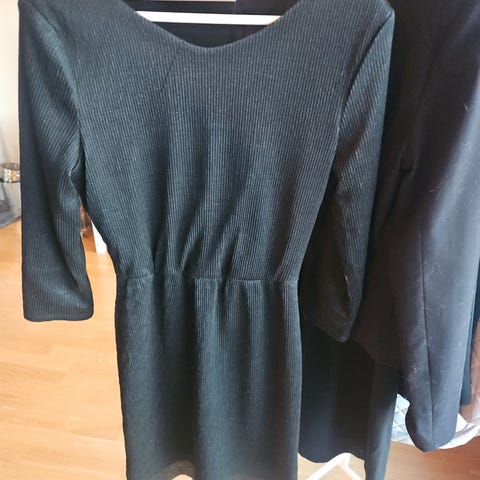 Vila festkjole i størrelse M for dame. Kjolen er svart og laget i polyester. Modellen er stroppeløs med paljettdetaljer øverst og i midjen. Skjørtet er lett og faller løst, med noe lengre bakdel for asymmetrisk uttrykk. Passer til formelle anledninger og festbruk.