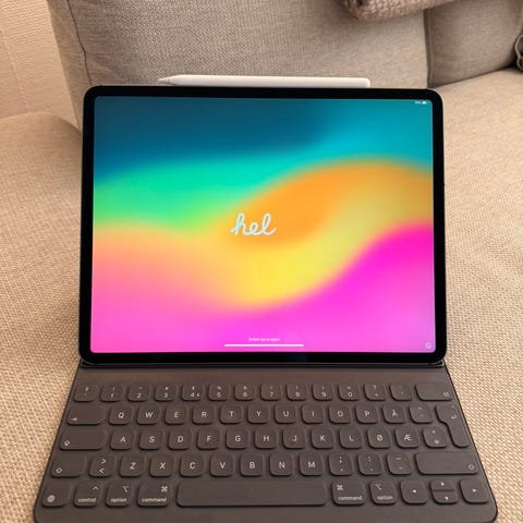 ipad pro 12,9 6. generasjon. Den har M2 chippen og med 265 GB. Alt fungerer som den skal. Det følger også med appelpencil og deksel.