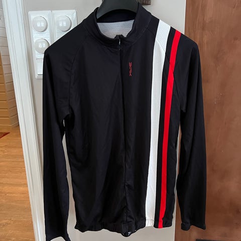 Sonin Bike System sykkeltrøye med kort erm i rød, svart og gul farge. Trøyen har glidelås i halsen foran og stor logo både foran og bak. På baksiden er det lommer nederst, typisk for sykkeltrøyer, egnet til oppbevaring av småting under sykling. Materialet er et lett og pustende stoff som er vanlig for sykkelbekledning. Passer til bruk på landevei eller terrengsykling i mildt til varmt vær.