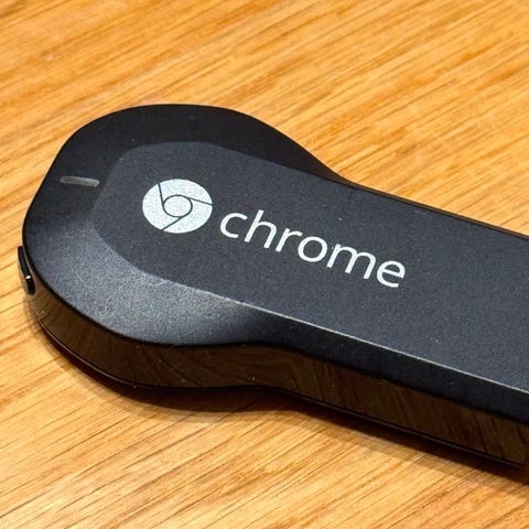 Google Chromecast med HDMI-tilkobling i grå farge. Enheten kobles til TV via HDMI og får strøm via medfølgende strømadapter og kabel. Chromecast brukes til trådløs strømming av lyd og bilde fra kompatible enheter som mobil, nettbrett eller PC til TV. Passer til TV-er eller skjermer med ledig HDMI-inngang og tilgjengelig strømuttak i nærheten.
