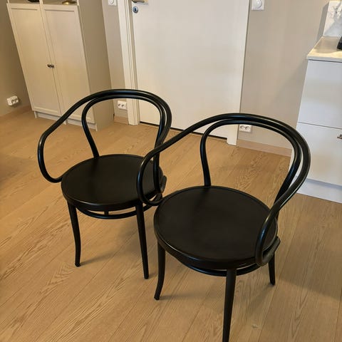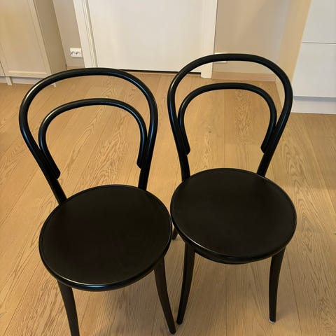 Selger 2 stk Ton stoler (No 14 med sete i rotting). Stolene er pent brukt og fremstår i god stand.