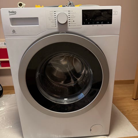 Beko frontmatet vaskemaskin i hvitt. Maskinen har frontåpning med rund dør og kontrollpanel med dreiehjul og display øverst foran. Egnet for vanlig klesvask i husholdning. Passer til plassering på bad eller vaskerom med avløp og vanninntak.