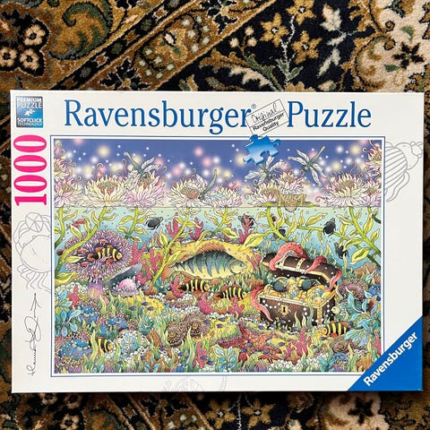 Ravensburger puslespill med 500 brikker. Motiv med fantasifull illustrasjon av blomster, fisker og figur i naturmiljø. Egnet for ungdom og voksne som liker puslespill med middels vanskelighetsgrad.