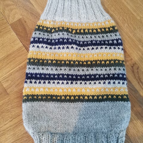 Godt brukte hjemmestrikkede gensere til liten hund. Gode å ha under regntrekk og på kalde dager.