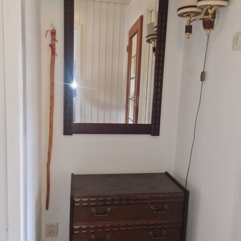 Hylle og tilhørende speil i tre, gies bort til førstemann som henter. Gies vekk samlet.