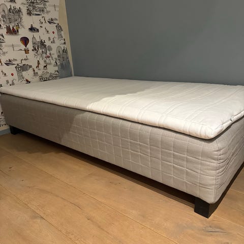 IKEA dagseng med oppbevaringsskuffer i hvit utførelse. Sengen har ribbebunn i tre og to romslige skuffer under liggeflaten for oppbevaring av sengetøy eller annet. Overflaten er i hvit laminat/folie. Det er synlige merker og slitasje på enkelte kanter og ved skruer, som vist på bildene. Egnet som enkeltseng eller dobbeltseng på soverom, barnerom eller gjesterom. 2 Madrasser på 80 cm følger med men ikke overmadrass. Gratis